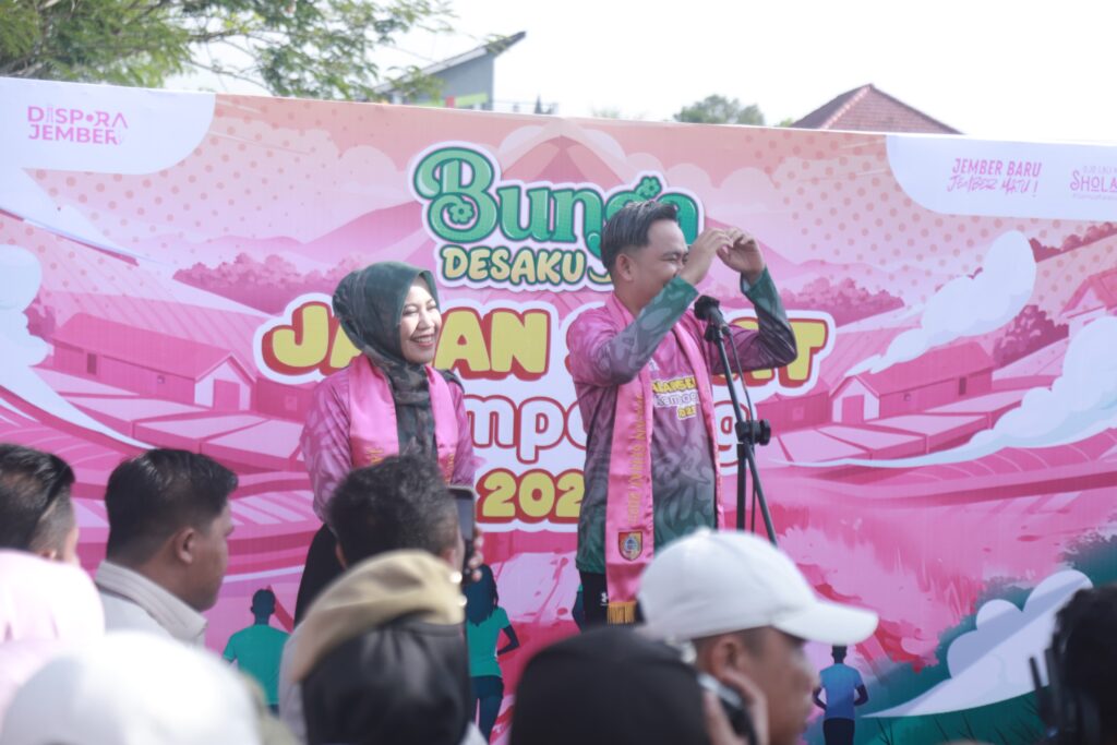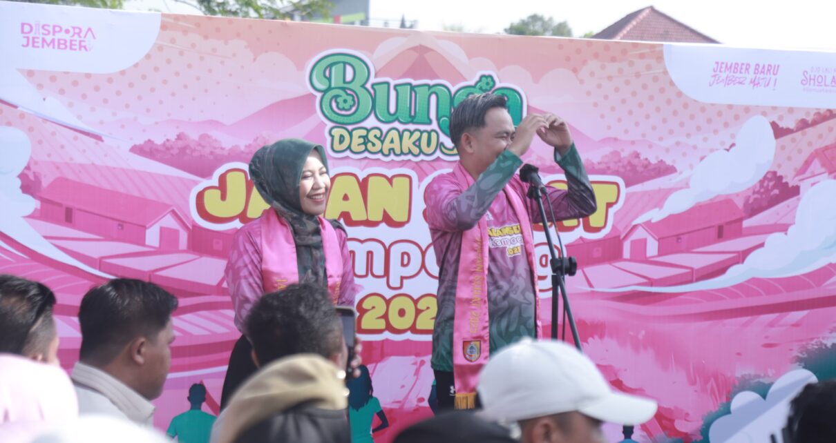 Bupati Fawait didampingi istrinya, Ning Gita, di Lapangan Darungan bersama ribuan warga Panti melakukan jalan sehat yang menjadi bagian kegiatan Bunga Desaku atau Bupati Ngantor di Desa dan Kelurahan.