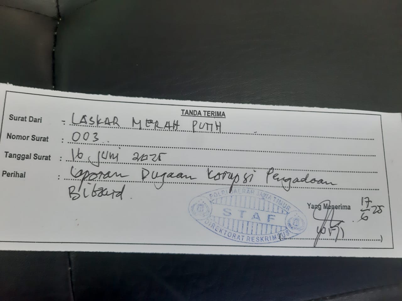 Bukti Surat laporan LMP yang di terima dari Polda Jatim. Foto by : Yudi