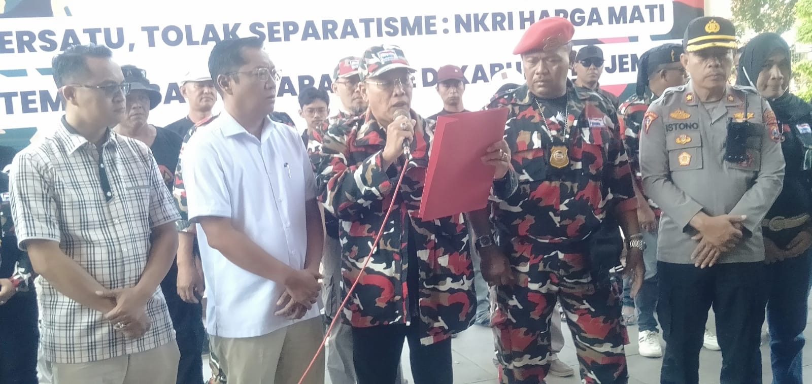 Drs. H. Helmi Murtaqi, Ketua Laskar Merah Putih Jember, saat menyatakan sikap “Menolak Separatisme dan Anarkhisme di Indonesia, khususnya Jember. Foto by : faktajember.